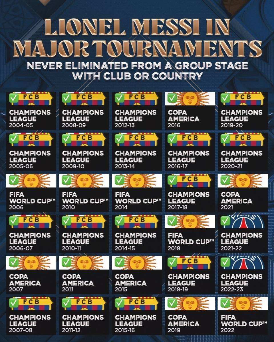 在转会至迈阿密国际之后,梅西参与了两个赛季的北美联赛杯比赛,队伍同样顺利晋级淘汰赛,并且在2023年荣膺北美联赛杯的冠军,实现了令人瞩目的成就。在代表阿根廷国家队的比赛中,梅西经历了五届世界杯和七届美洲杯,同样从未止步于小组赛,并于2022年带领球队夺得了世界杯冠军,并且两次荣获美洲杯的桂冠。
