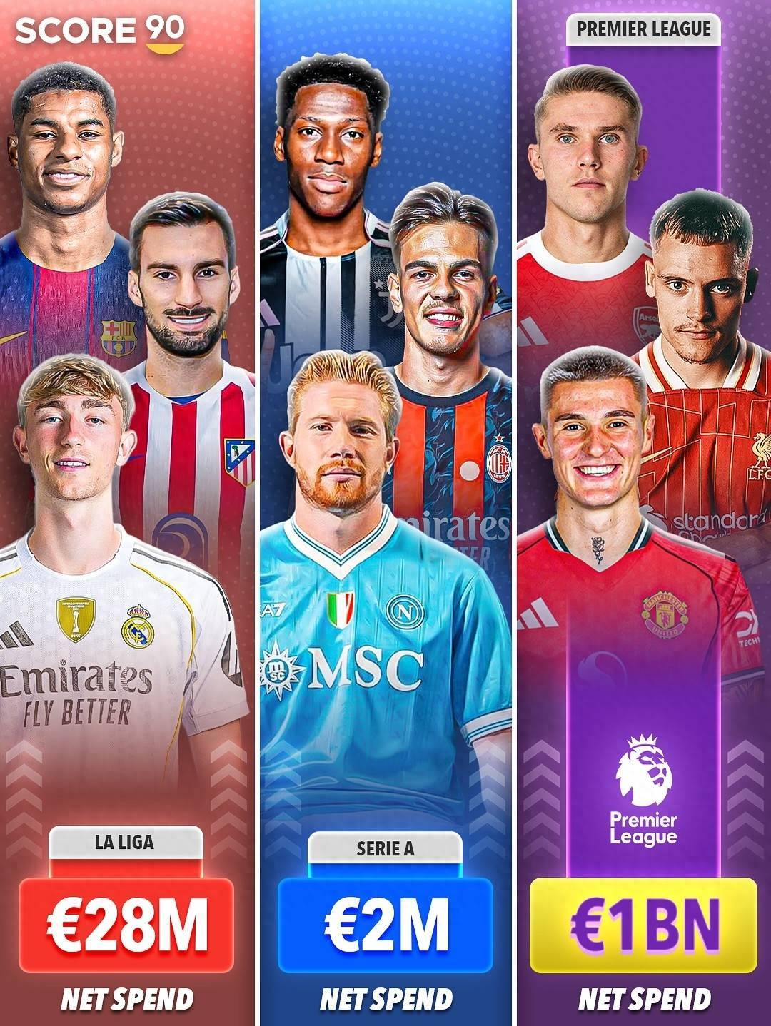 近日,外媒SCORE90统计了欧洲四大联赛(英超西甲意甲德甲)在今年夏窗的投入情况,其中英超以10亿欧元的净支出是断崖式领先,西甲净支出2800万欧元,意甲净支出200万欧元,德甲则在转会市场狂赚1.4亿欧元,其中利物浦签下勒沃库森前腰维尔茨和法兰克福前锋的开销就超2亿欧元。
